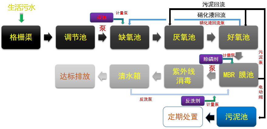 集裝箱式一體化污水凈化設備的重要部件是膜生物反應器(MBR)。污水進入MBR系統,A區為兼氧區,放置填料,并與活性污泥進行充分接觸;O區為好氧區,放置膜組器,使用MBR膜將活性污泥和大分子有機物質截留住,省掉二沉池。活性污泥濃度因此提高,水力停留時間(HRT)和污泥停留時間(SRT)可以分別控制,而難降解的物質在反應器中不斷反應、降解。進一步處理之后,被處理水可以達標排放或回用。此外,輸送到MBR系統中的空氣也是處理過程中重要的一部分,它可以促進反應器中流體的循環流動,提高活性污泥的降解效率,還可以使中空纖維膜膜絲之間發生相互摩擦,清潔膜組件。