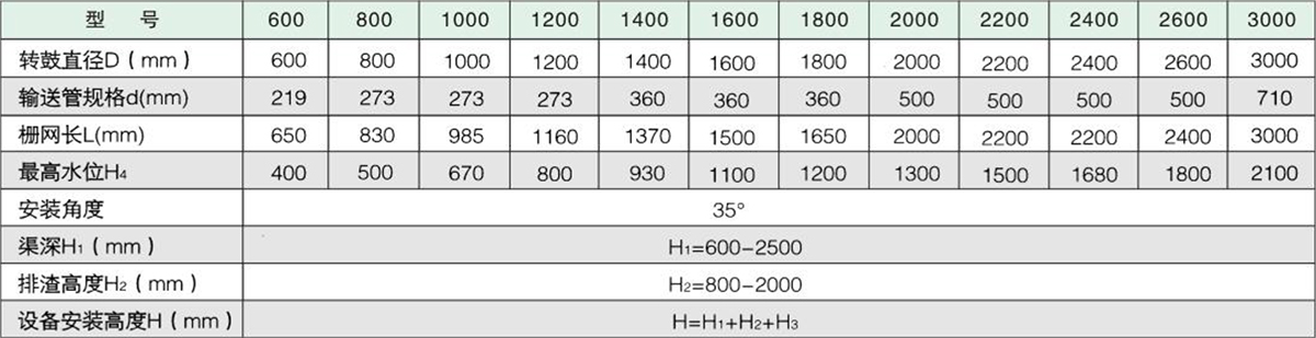 設備與水平面成35度安裝在水渠中,污水從格柵開式端口流經(jīng)柵條進入渠道中,柵條將固體污物截留,到一定的水位差時,定位在中心軸上的旋轉(zhuǎn)耙在柵鼓內(nèi)旋轉(zhuǎn),旋轉(zhuǎn)耙耙齒插入格柵條內(nèi)將格柵條清潔,并帶動向上運轉(zhuǎn)。當運行至高點時,所有柵渣落入中央柵渣螺旋槽內(nèi),并通過中央柵渣螺旋槽內(nèi)螺旋輸送壓榨機擠干、脫水,并運至上端排料斗排出。